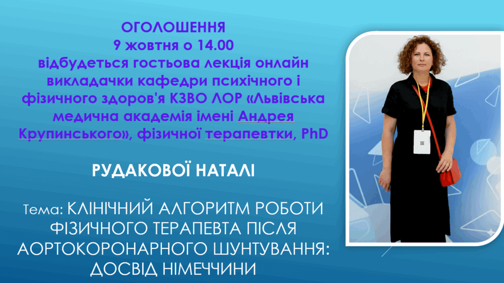 9 жовтня о 14.00 відбудеться гостьова лекція онлайн викладачки кафедри психічного і фізичного здоров’я КЗВО ЛОР «Львівська медична академія імені Андрея Крупинського», фізичної терапевтки, PhD